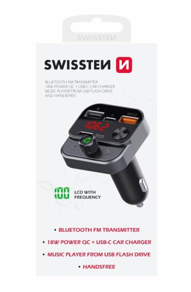 Swissten FM adó 2x USB-A és 1x USB-C - fekete